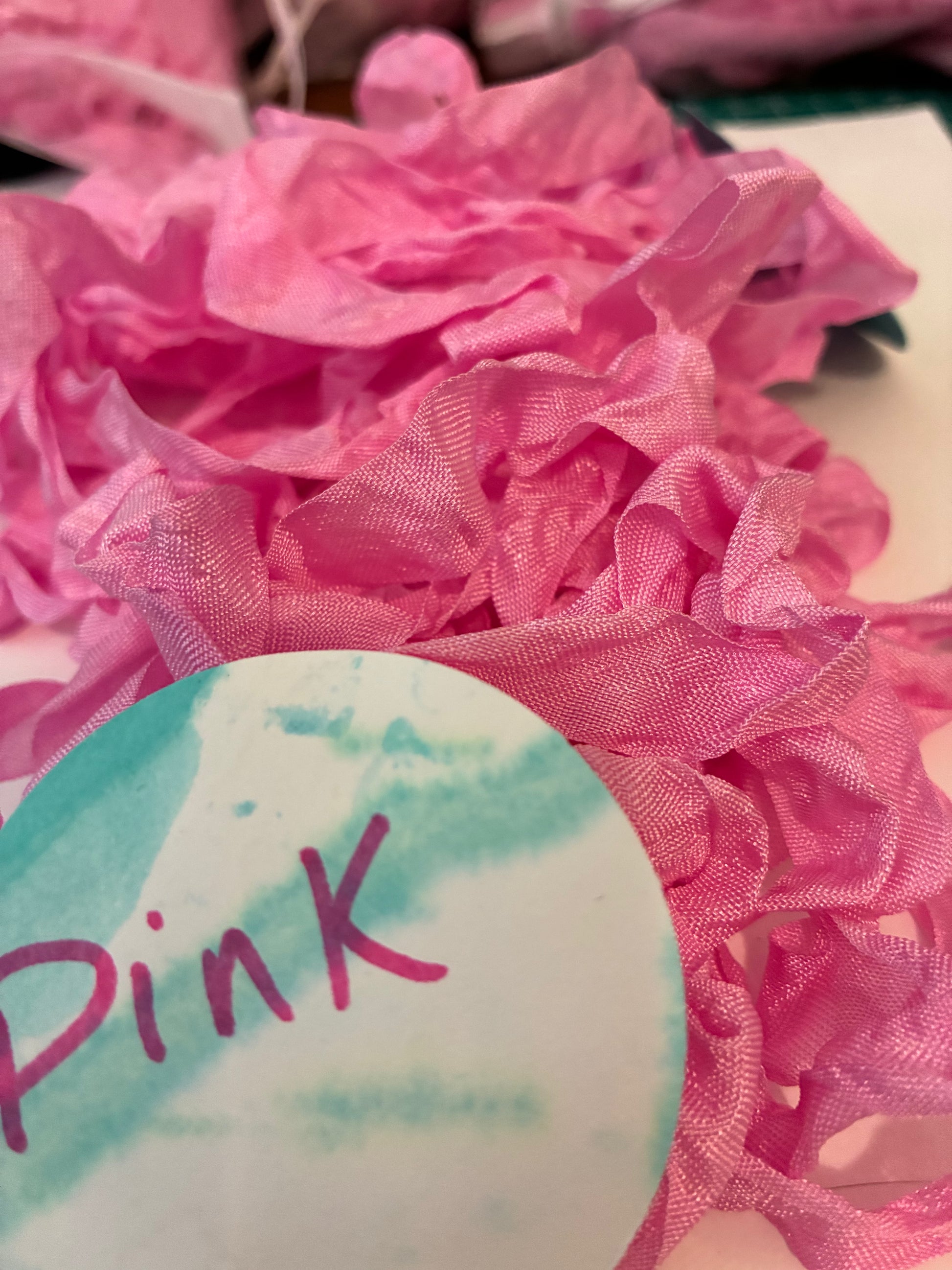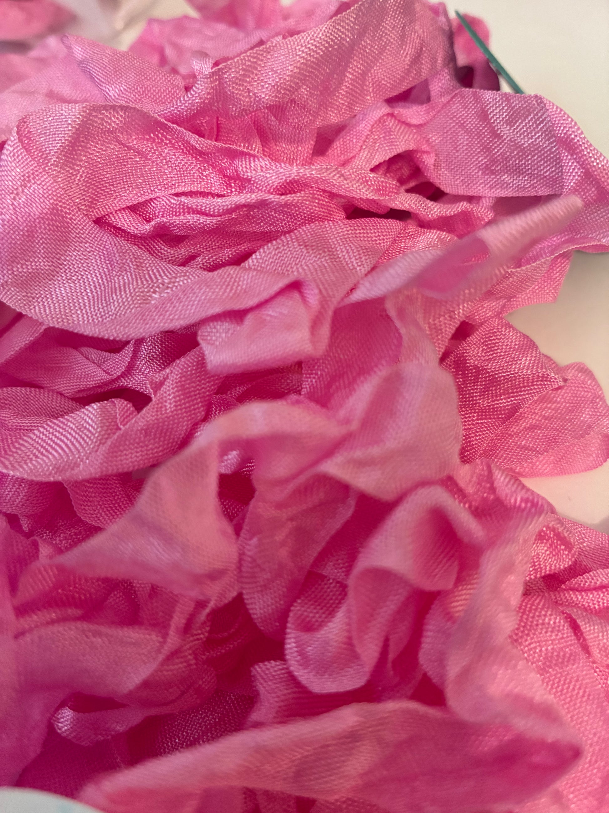 Pretty in Pink seam binding. 5-yards uncut crinkled seam binding in re-useable white mesh bags.
